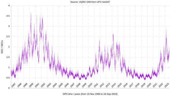 Figure 2. GEC, expressed in GECU, vs. time, in years, since the end of 1996 to September 2023. It has been computed from UQRG GIMs, with a time resolution of 15 min.