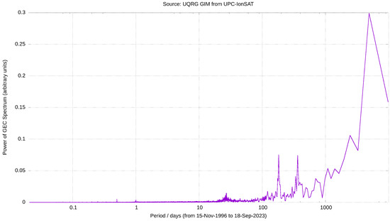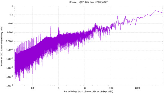 Figure 4. Logarithm of the absolute value of the GEC FFT, expressed in GECU, vs. logarithm of period in days, since the end of 1996 to September 2023. It has been computed from UQRG GIMs, with a time resolution of 15 min.