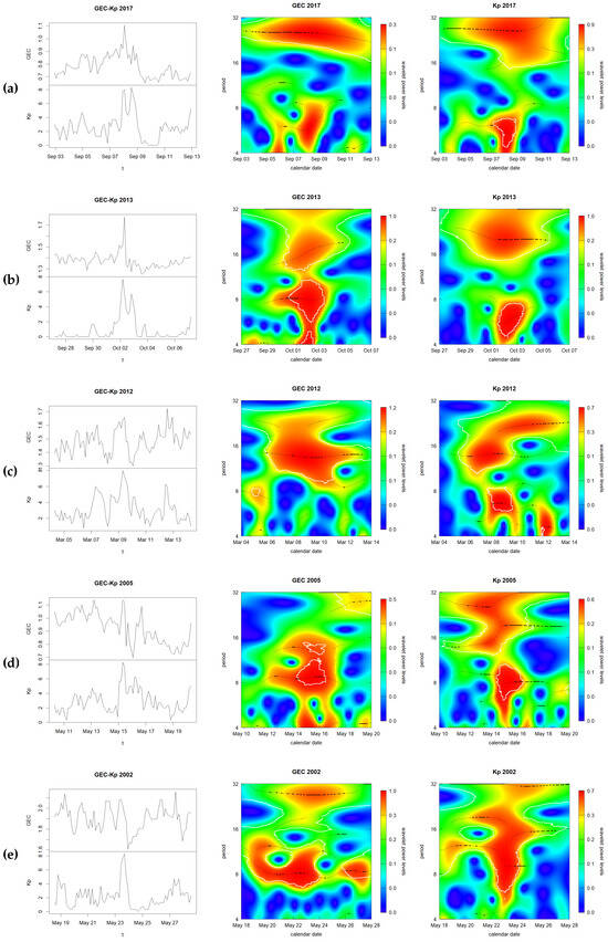 Figure 5. Representative examples of GEC and Kp time evolution (top and bottom, respectively of left-hand plots), GEC spectrograms (central plots) and Kp spectrograms (right plots), vs. time (horizontal axis, in days) and period (vertical axis, in multiples of three hours), with extremely high similarity (day 8 September 2017, row a), high similarity (day 2 October 2013, row b), mid similarity (day 9 March 2012, row c), low similarity (day 15 May 2005, row d) and extremely low similarity (24 May 2002, row e).