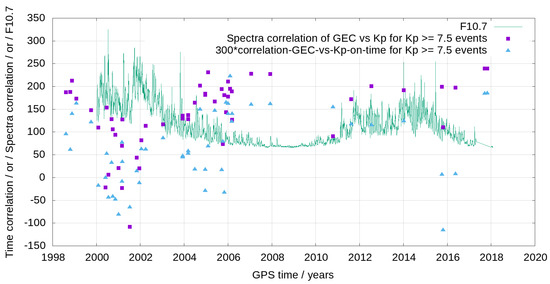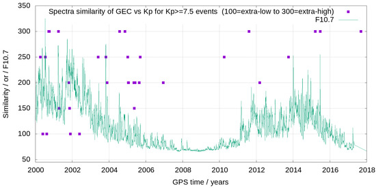 In summary, more than 50% of the GEC and Kp spectrograms during the geomagnetic events appear high or extremely high correlated by visual inspection, and only 21% of them appear low or extremely low correlated (see Table 2). In order to understand the context of low or extremely low spectral similarity between Kp and GEC, we represent the time evolution of Kp and GEC qualitative spectral similarity, besides F10.7 index, during the solar cycle in Figure 6. It can be seen that geomagnetic storms with Kp 7.5 presenting extremely low similarity between GEC and Kp spectra (four cases of 34) happen around the two extremely high F10.7 peaks (>200) of previous solar cycle.