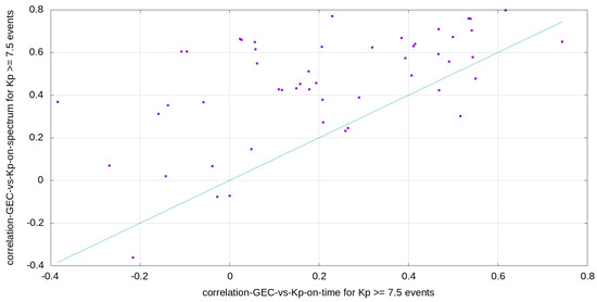 Figure 8. Points representing the correlation between GEC and Kp spectra vs. the corresponding correlation of GEC and Kp time evolutions during the geomagnetic events with Kp ≤ 7.5 (the straight line represent equal values for both).