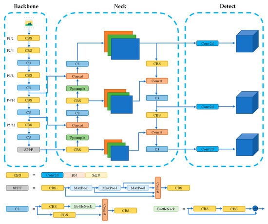 The network architecture of YOLOv5-6.0 is illustrated in Figure 3. The backbone network, known as CSPDarknet53, is responsible for extracting features from input images, capturing essential semantic information. To further enhance feature extraction and detection accuracy, it utilizes a neck network that integrates multi-scale features from different layers of the backbone network. This allows the model to capture both fine-grained details and high-level contextual information. It also employs multiple detection heads, each responsible for predicting object bounding boxes and class labels, ensuring accurate and efficient object detection. By combining these components, YOLOv5-6.0 achieves outstanding performance in object detection tasks, striking a balance between accuracy and computational efficiency.
