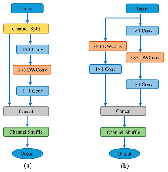 Shufflenet v2 network structure. (a,b) represent the basic module and downsampling module of Shufflenet v2, respectively.