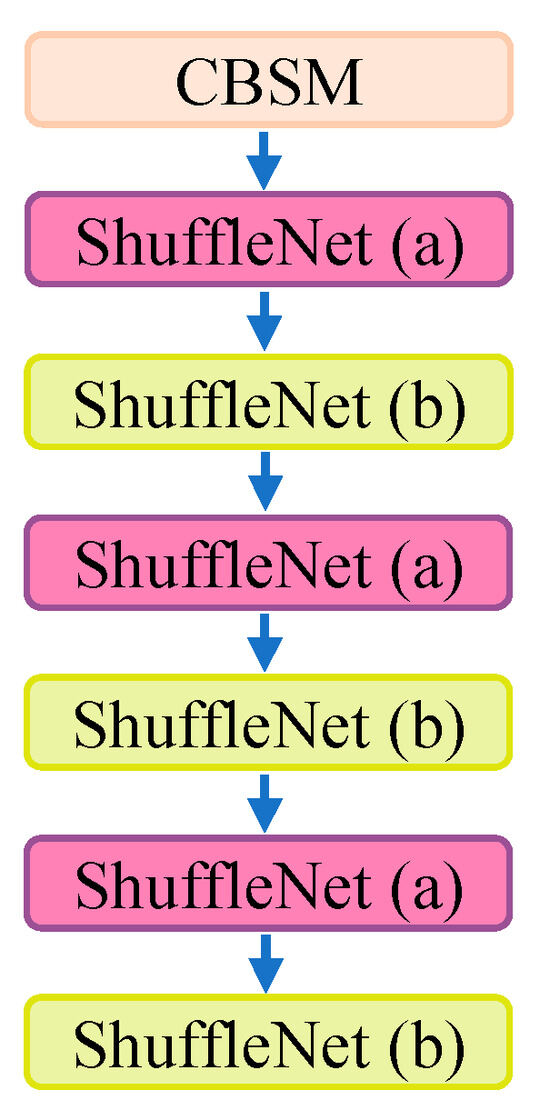 The modified backbone network structure. ShuffleNet (a) and ShuffleNet (b) represent the basic module and downsampling module of Shufflenet v2, respectively.