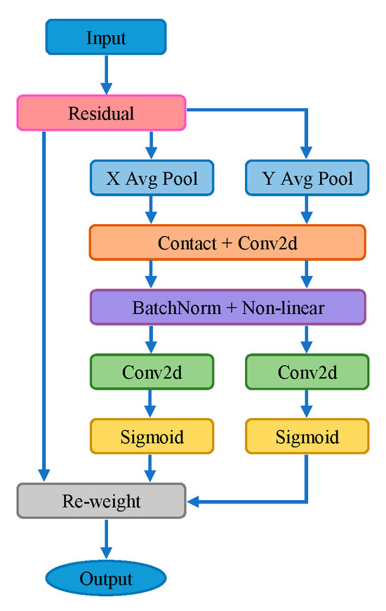 The attention mechanism focuses on key information in the feature map by performing element-wise multiplication with the input feature map. The final output is shown in Equation (8). The structure of the coordinate attention mechanism is shown in Figure 7.