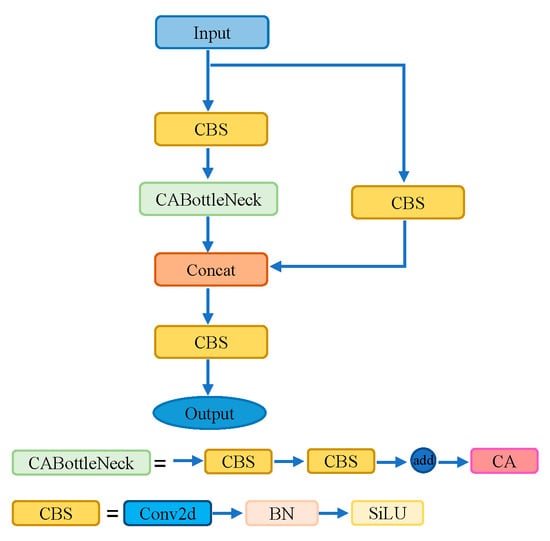 We introduced the coordinate attention (CA) mechanism into the BottleNeck module of the C3 module, combining CA with C3 to form the C3_CA module. The network structure of C3_CA is illustrated in Figure 8.