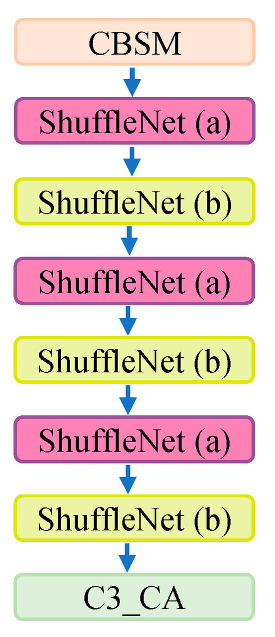 The modified backbone network structure with C3_CA. ShuffleNet (a) and ShuffleNet (b) represent the basic module and downsampling module of Shufflenet v2, respectively.