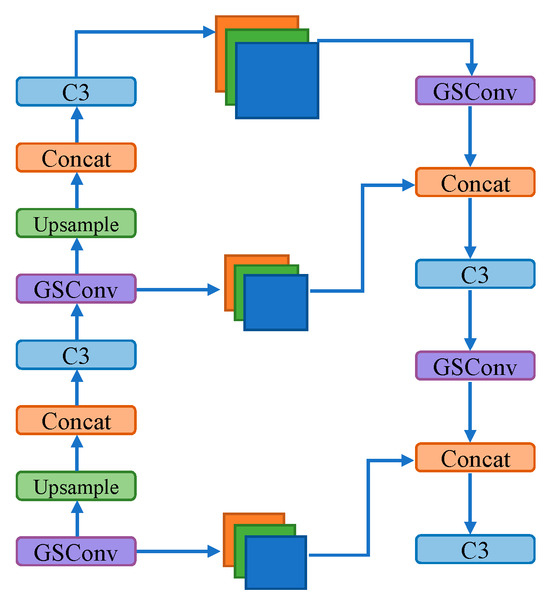 GSConv combines depth-wise separable convolution with standard convolution. It concatenates the results of depth-wise separable convolution and standard convolution, combining their feature maps. Then, the Shuffle operation is applied to achieve mutual permutation between the feature maps from depth-wise separable convolution and standard convolution. While depth-wise separable convolution almost completely severs the connections between each channel, standard convolution can effectively preserve these connections. Therefore, GSConv can alleviate model complexity while maintaining accuracy, striking a balance between accuracy and inference time. The network structure of GSConv is illustrated in Figure 10. The modified neck network structure is illustrated in Figure 11.