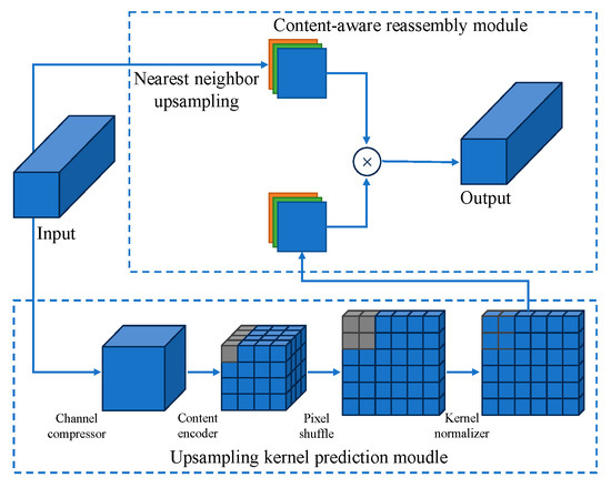 To reduce the deviation between the model’s detection boxes and real targets without adding excessive computational complexity, we introduced the CARAFE [37] lightweight upsampling operator, replacing the previous upsampling module with CARAFE in the model. It can improve the performance of model upsampling, achieving more precise localization. CARAFE achieves an expanded receptive field and establishes correlations between input information and feature maps without introducing excessive computational complexity or additional parameters. This innovation leads to superior performance compared to traditional upsampling methods. CARAFE provides object detection tasks with enhanced feature representations and improved preservation of fine-grained details, ultimately boosting model efficiency and effectiveness.