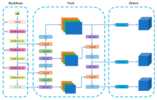 YOLOv5 was improved by integrating the Shufflenet v2 network, attention mechanism, neck convolution block, and CARAFE upsampling operator. Replacing the backbone network with Shufflenet v2 enables fast feature extraction of input images at different scales. The introduction of the attention mechanism between the backbone network and the neck enhances the network’s ability to extract and locate crucial information. Replacing the convolution module in the neck network with the GSConv block and modifying the upsampling method to CARAFE further enhances the model’s accuracy. Additionally, due to the change in network depth, modifications were made to the corresponding parameters of concatenation operations and detection heads. The overall framework of the proposed model in this paper is illustrated in Figure 14.