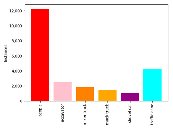 Due to the complex environment at tunnel construction sites and the difficulty in data collection, it was necessary to augment the collected image data to increase the quantity and spatial diversity of the dataset. This includes applying techniques such as horizontal flipping and brightness enhancement to enhance the learning capability of the deep neural network. After data augmentation, a total of 8000 images were obtained. The dataset was categorized into six classes based on representative objects commonly found at the construction site: worker, construction vehicles, and traffic cones. The corresponding labels for these classes were assigned as “people”, “excavator”, “mixer truck”, “muck truck”, “shovel car”, and “traffic cone”, respectively. After annotation, the approximate number of labels for each category was as follows: 12,000 for “people”, 2100 for “excavator”, 1700 for “mixer truck”, 1750 for “muck truck”, 1600 for “shovel car”, and 4100 for “traffic cone”. Figure 15 shows the distribution of the number of labels in the dataset.