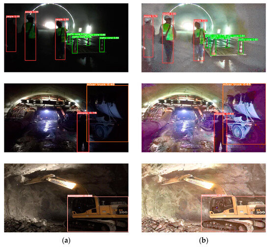 In tunnel environments, images are often compromised by low exposure, resulting in the loss of crucial feature information and thus increasing the complexity of model detection. Enhancing the original images through EnlightenGAN makes the images clearer and more suitable for model detection. Figure 17 illustrates a comparison between the enhanced and original images, as well as a comparison of their detection performance within the same model.