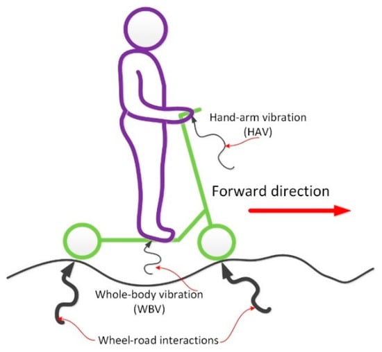 Cafiso et al. [31] measured and compared accelerations on an e-scooter, bicycle and car from a comfort perspective. Boglietti et al. [32] compared vibrational dynamics between e-scooters and e-bikes using UNE-2631, obtaining higher vibration magnitudes for e-scooters. Antoniazzi and Davoli [33] applied the methodology suggested by Cano-Moreno et al. [21] and measured the vibrations received by e-scooters on different pavements and at different speeds to evaluate their influence on driver comfort. Cano-Moreno et al. [34,35] also sensorized a Citycross model scooter, thus obtaining the influence on comfort and health of real measurements of accelerations using an Arduino as data acquisition equipment. The results of all these studies are consistent and coherent with each other and with those obtained in the dynamic simulation model. Figure 2 shows the main sources of vibration for an electric scooter driver.