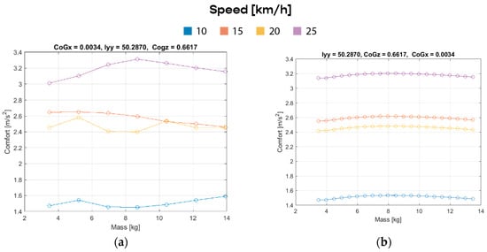 The design of the experiment aims for the results obtained to evaluate the sensitivity of the different characteristic parameters of the e-scooter frame to the driver’s comfort. For this, the following parameters related to the mass geometry and that have influence on the implemented 2D dynamic model will be studied independently. Table 8 shows the variations in mass, centre of gravity and moment of inertia with respect to the lateral axis and the percentage of variation they represent with respect to the model value taken as a reference (0%). The simulation values for the rigid solid formed by the e-scooter frame and human can be calculated with these values and using Equations (2) and (3) for coordinates of centre of gravity. The mass will be added to the human mass, and the lateral inertia moment is presented in this table also for the total rigid solid.
