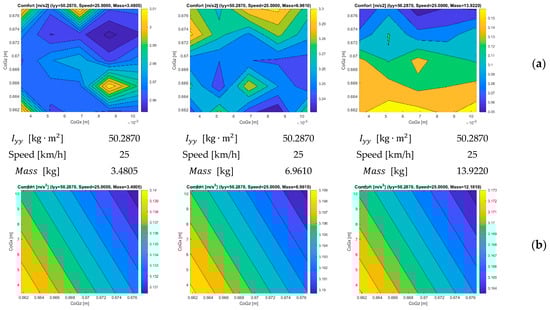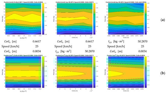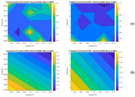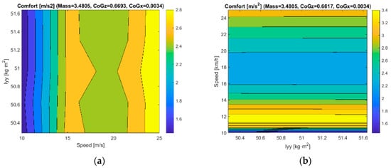 The mass has been varied from −50% to +100%, with a total of 7 levels. This parameter has more levels due to its greatest influence in relation to others. The coordinates of the centre of gravity in both x and z and the value of the moment of inertia of the axis perpendicular to the simulation plane have been varied from −50% to 50% of each reference value, with each one being divided into 5 levels. Additionally, each combination of these 875 combinations will be simulated for each of the following 4 speeds: 10 km/h, 15 km/h, 20 km/h and 25 km/h. This means that in total 3500 different combinations will be simulated.