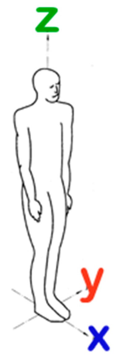 In this standard, acceleration is established as the primary quantity of vibrations, and the origin of the coordinate system is the point from which the vibrations enter the human body. In the case of calculating the vibrations that are transmitted to a person in a standing position, as is the case of the driver of an electric scooter, the standard stipulates that the measurements must be made on the surface on which the feet are [37] (see Scheme 1).