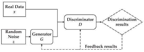 As shown in Figure 4, GAN is essentially an adversarial process generated by two neural network models competing with each other. The generator G generates fake simulated data after inputting raw random noise obeying a specific distribution. The discriminator D tries to perform a binary classification task to distinguish actual data from the fake data generated by the generator. There is no fixed choice of neural network models for the generator and discriminator, and two multilayer perceptrons are chosen in [17] to complete the training of the GAN by updating the network parameters. When training the GAN, the discriminator D is generally trained first, and the generator G is trained alternatively. According to [17], the objective optimization function of the GAN can be expressed as