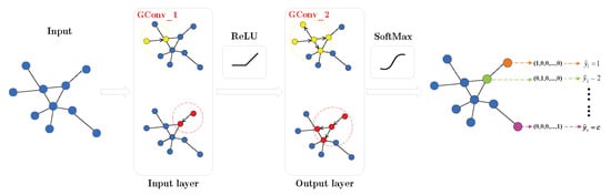Stacking multiple graph convolution layers allows the aggregation of feature attribute information from neighboring nodes in higher-order neighborhoods. Therefore, we use the output of the previous graph convolution layer as the input for the next graph convolution layer. After the second graph convolution layer, another set of node features, , is learned. It is noteworthy that the GCN constructed in Figure 5 uses only two graph convolution layers. Thus, the output feature matrix of the second graph convolution layer should have the same size as the label matrix , indicating a change in the feature vector dimension of nodes in the graph. Finally, the feature matrix is processed through the SoftMax activation function to obtain the ultimate output: