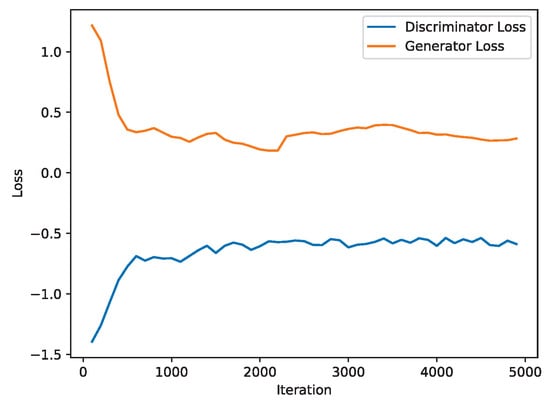 As described in Section 3.2, we generate a large amount of simulated data that match the actual data distribution using WGAN-GP. In the training process of WGAN-GP, the model’s training process can be intuitively reflected by the loss function diagram of the discriminator and the generator. When WGAN-GP is used to fit the actual network data under the network fault scenario of “large station spacing” in the original data set, the loss function of the generator and the discriminator are shown in Figure 7. If the loss value of the discriminator tends to converge, it means that the better the WGAN-GP is trained, the higher the quality of the generated simulated data samples is, and the closer to the distribution of the actual data samples. As seen in Figure 7, the loss function value of the discriminator has a large oscillation at the beginning, then oscillates slightly after it quickly converges. It indicates that the model is in the learning stage at this time, and the model has not yet found the optimal solution direction. After about 2000 training cycles, the model gradually becomes stable, and the gap between generated and real samples gradually decreases. The discriminator gradually cannot distinguish between real and generated samples, and the performance in the graph is gradually becoming stable.