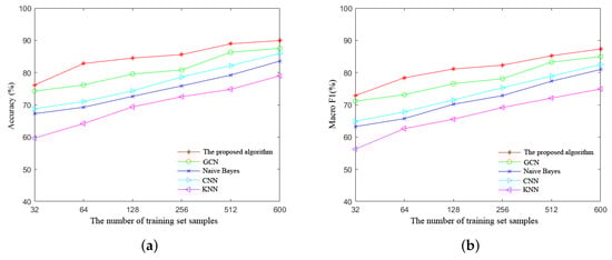 To demonstrate the effectiveness of the proposed algorithm, we compare it with other algorithms. We compared the parameter settings of CNN [24], KNN [25], and GCN [15] separately. The parameter setting method for naive Bayes has been introduced in Section 4.3. Since the proposed method uses a combination of naive Bayes and graph convolutional neural networks, it is also necessary to compare it with these two algorithms separately. We carry out a total of six groups of experiments; the size of the training set used in each group is 32, 64, 128, 256, 512, and 600, respectively. In the simulation experiments, the model’ s performance will be represented by the accuracy and macro F1 values. Accuracy assesses the overall correctness of a diagnostic model, representing the proportion of correctly classified samples in the predictions. Macro F1, considering the predictive performance for each class and suitable for imbalanced data sets, is the harmonic mean of accuracy and recall. Meanwhile, to reduce the experimental error, the results of each group of experiments are averaged after ten repetitions, and the simulation results are shown in Figure 8a,b.