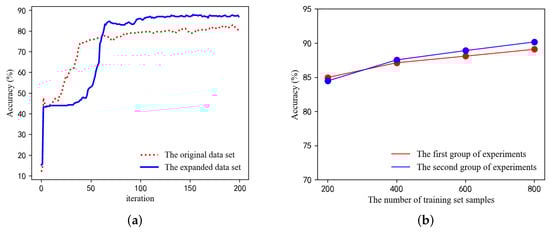 Next, to verify the impact of the expanded data of the GAN on the accuracy of the overall algorithm model, we conducted experiments based on the original data set and the data set expanded by WGAN-GP to compare the diagnostic accuracy of the proposed algorithm under different situations. The final simulation results are shown in Figure 9a. It can be seen that when using the expanded data set, the simulated data generated by the GAN is indeed consistent with the distribution of actual data in reality, so the algorithm model can obtain sufficient and accurate label information during the training process, which makes the diagnostic accuracy of the model higher.
