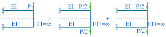 To simplify the calculation process, the perceived force P of the elastic element can be decomposed into a pair of co-directional forces composed of P/2 and a pair of opposite forces composed of P/2 according to Figure 5. The pair of opposite forces are cancelled due to the connecting members between parallel beams treated as rigid bodies.