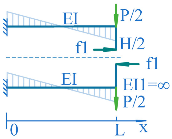 As shown in Figure 7, it can be proven that, when the action point of the P force is translated to , , the parallel beam elastic element transforms into an S-type elastic element. Compared with P acting on x = L, the P force exerts a negative torque on the rigid connection between parallel beams, and its value is . The radius of curvature r of a parallel beam along the x-direction can be expressed as: