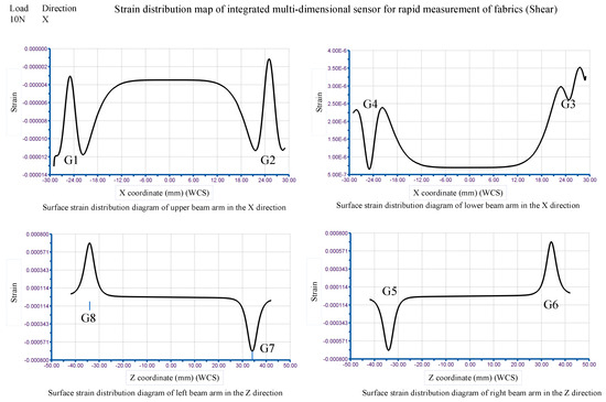 At the position of the fabric clamp jaw line, in the x-direction, a force of 10 N is applied to the rapid measurement sensor and the results of the finite element simulation shown in Figure 15 have been obtained. The figure shows the stress distribution on the surfaces of the four strain beam arms. They are based on the corresponding four reference hard lines.