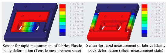 As can be observed in Figure 16, the sensor elastic element undergoes a displacement of 0.3079 mm in the tensile measurement direction and 0.3991 mm in the shear measurement direction, respectively, under a force of 10 N in the corresponding direction.