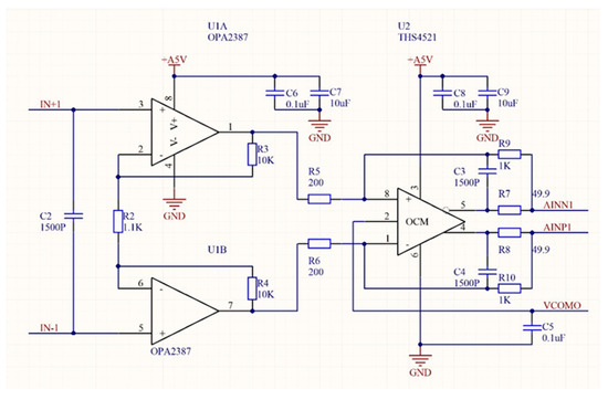 The analogue channel signal conditioning circuit is shown in Figure 17. In Figure 17, U2 is designed according to Texas Instruments’ requirements for the analogue channel driver circuit of the ADS1274 chip [29]. But, for our sensor signal, the amplification provided by U2 cannot fully utilise the dynamic input range provided by ADS1274. In this design, we added a differential amplifier composed of U1, which also greatly increases the input impedance of the entire amplifier. Hence, U1 and U2 combine to form an instrumentation amplifier. U1 is a pair of high-precision, low-offset, low-temperature-drift operational amplifiers. U1 and U2 form a fully differential amplifier. The output of the amplifier is used to drive the ADC. The circuit provides 100 times the analogue signal amplification and high common mode rejection for each measurement channel. In addition, the analogue signal conditioning circuit provides the ADC with an anti-aliasing filter function. The anti-aliasing filter is a first-order low-pass filter whose passband bandwidth is determined by R7 + R9 and C3 in Figure 17. R8 + R10 and C4 are dual elements of R7 + R9 and C3.
