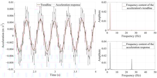 Figure 1, as an example, shows the acceleration signal recorded in the middle of the simply supported bridge under a moving sprung mass. The black color in Figure 1 refers to the acceleration response, and the red color refers to its trendline calculated using the Savitzky–Golay filter. Figure 1 shows the response’s fast Fourier transform (FFT) and trendline. As seen in Figure 1, the red FFT curve was weakened by the Savitzky–Golay filter, but they both have the same amplitude at 2.93 Hz (the third natural frequency vanishes from the curve). Even with the naked eye, it can be seen from Figure 1 that the trendline only consists of a unique natural frequency. Figure 1 proves that the well-adjusted Savitzky–Golay filter keeps the first natural frequency but attenuates the other natural frequencies and noises. The subsequent natural frequency in this figure is 25.5 Hz, which is the third bridge natural frequency. Since the second natural frequency of the bridge cannot be recorded in the middle of the bridge, it cannot be seen here.