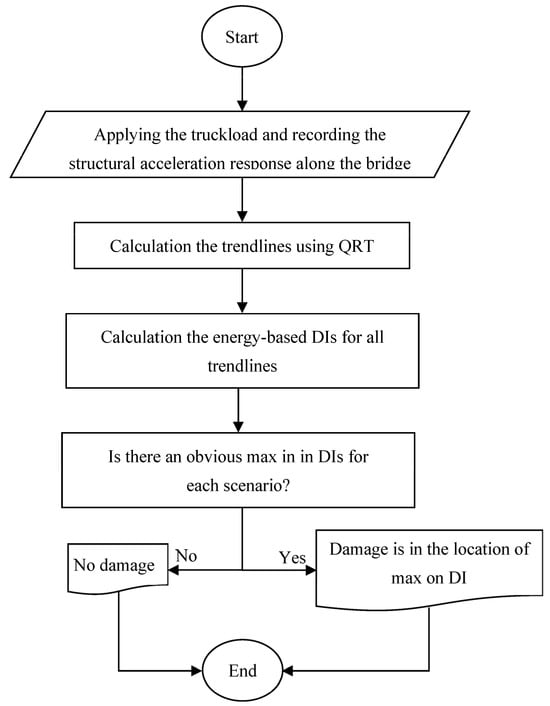 As shown in Figure 2, the trendlines calculated using both methods are almost the same, but their frequency contents are a bit different. For example, the third natural frequency is completely vanished and, except for the first natural frequency, the amplitude of the rest of the frequencies is lower when QRT is utilized. Therefore, compared with the Savitzky–Golay filter, the QRT identifies a better trendline regarding frequency content for a signal. It should be noted that the resulting trendlines represent the dynamic behavior of a structure in a specific natural frequency. The flowchart of the proposed method is shown in Figure 3.