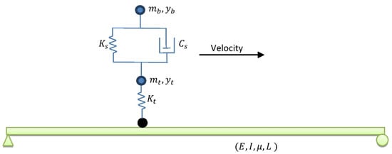A simply supported bridge under a truckload is usually used to verify the accuracy of most bridge damage-detection methods initially [,,]. Although a truckload in such a simulation can be defined as 1—moving concentrated load, 2—moving mass, and 3—moving sprung mass, a theoretical study proved that the moving sprung mass could show a better simulation for a truckload []. Moreover, shifts in bridge natural frequencies due to the interaction between the bridge and vehicle can also be simulated when the moving sprung mass is utilized [,,]. Therefore, a numerical model of a simply supported bridge with a length of 25 m under a moving sprung mass with different velocities is considered in this paper. A schematic view of this bridge is shown in Figure 4. The details of the bridge and truckload are listed in Table 1 and Table 2. It should be noted that the rotational degree of freedom of the moving sprung mass is restricted in this simulation.
