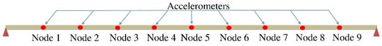 ABAQUS software 6.14 was utilized to establish the FEM model of bridge–vehicle simulation. In the first step, gravity was applied to the FEM model. In the second step, the moving sprung mass moves along the simply supported bridge, and the bridge acceleration responses were recorded at fixed distance positions with a sampling frequency of 2000 data per second. The full Newton algorithm was utilized to perform the static and dynamic analysis in the FEM model. The moving sprung mass was modeled using three reference points and two springs, which can only vibrate vertically when they move along the bridge with constant velocity. The mass of the vehicle body and axle is assigned to the top two reference points. Frictionless hard contact was used as an interaction type between the bridge and the third reference point. The low-damped system has been reported for many simply supported bridges in the literature [,], and therefore, the bridge’s damping was also ignored in this simulation. However, the moving sprung mass has a damper as mentioned in Table 2. Figure 5 shows the uniformly distributed nodes along the bridge where the acceleration responses were obtained. Additionally, five damage scenarios were also introduced to the bridge, as listed in Table 3.
