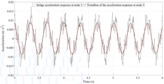 The black signal is the acceleration response of the bridge recorded at Node 3 under a truckload with a velocity of 2.5 m/s. The red signal is the trendline of the acceleration response calculated using QRT.