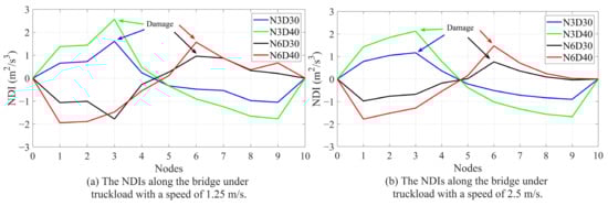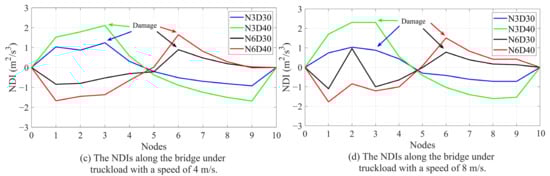 The NDIs along the bridge of different scenarios and different velocities: (a) velocity = 1.25 m/s, (b) velocity = 2.5 m/s, (c) velocity = 4 m/s, (d) velocity = 8 m/s.