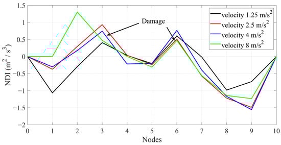 As mentioned above, there should be a maximum in the NDI in the vicinity of structural damage. Figure 7 shows the NDI for each scenario (single damage) and velocity. Figure 8 shows the multi-damage scenario and different velocities. Figure 7 and Figure 8 show that the maximum number of NDIs in each scenario can easily be detected except for a velocity of 8 m/s. Hence, the accuracy of the proposed method will decrease by increasing the vehicle’s velocity. The results shown in Figure 7 and Figure 8 are from noise-free environments.