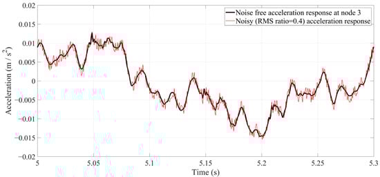 Acceleration response at Node 3 under a truckload with a speed of 2.5 m/s. The black color is a noise-free response, and red color is a noisy response (RMS ratio = 0.4).