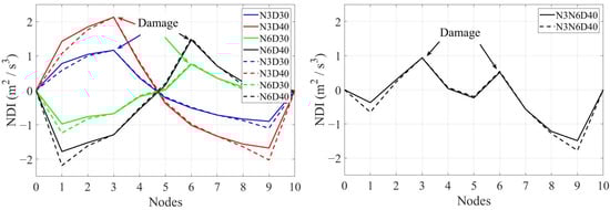 In Equation (7), is the normalization factor for node . Index “” refers to the undamaged scenario (intact scenario) and therefore is the energy of the trendline at node for the undamaged scenario. The is the average of all . In the next step, the NDI is calculated using the following formula: