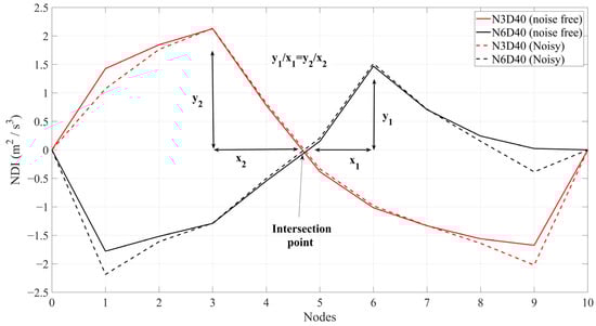 The approach used in [] is employed here to quantify the severity of structural damage. It should be noted that only single-damage scenarios are discussed here in this subsection. A closer look at Figure 7 and Figure 10 shows an intersection point of the lines between Nodes 4 and 5 where all DIs have a 0 value. That means the proposed method is incapable of either locating the damage or quantifying the severity of damage in the vicinity of the middle of the bridge. Figure 11 shows the intersection point and the concept of damage quantification using DIs.