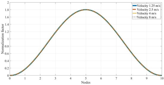 As seen in Figure 12, the normalization factor of all nodes follows a Gaussian pattern. Moreover, all the curves belonging to different velocities fall on each other. Hence, based on Figure 12, three significant advantages can be learned, namely: (1) it is acceptable to use the normalization factor of a velocity for another velocity, and that means there is no need to keep the vehicle velocity constant during the tests, (2) if an accelerometer experiences a problem or there is no accelerometer at a position, it is easy to calculate its normalization factor using the Gaussian pattern, (3) there is no need to have a uniformly distributed accelerometer for the undamaged scenario and the Gaussian pattern can be easily determined using only a few accelerometers. Therefore, since the baseline can be easily calculated using the Gaussian pattern and the proposed method can be considered a baseline-free method.
