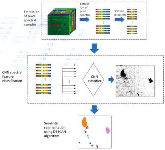 For detecting oil spill areas from the collected hyperspectral images, our proposed oil spill area detection method primarily utilizes a convolutional neural network (CNN) classification model and the DBSCAN clustering algorithm. CNN is a widely used model for classification tasks, leveraging convolutional and pooling layers to effectively capture meaningful features of pixel spectra. The convolutional operations enable adaptability to features of different scales. The DBSCAN clustering algorithm is well suited for regions with significant density variations. It excels in adapting to differences in density across various areas in an image, requiring no predetermined number of clusters. This algorithm can identify clusters of arbitrary shapes and exhibits robustness to noise. By combining the advantages of CNN and the DBSCAN clustering algorithm, our method is better suited for segmenting hyperspectral images. In accordance with Figure 2, our devised method for oil spill area detection from the collected hyperspectral images encompasses three primary steps: