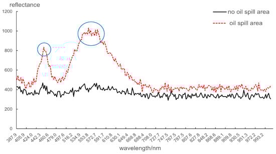 Spectral reflection intensity curve in oil spill and no oil spill area.