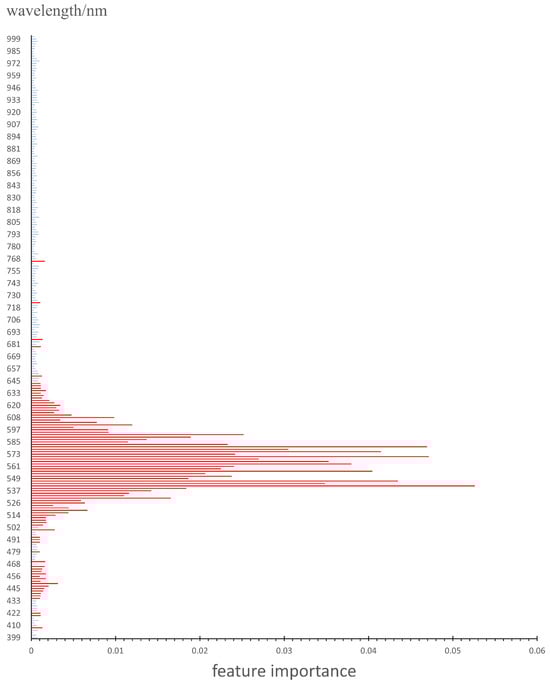 In the oil spill simulation experiment, we collected spectral reflectance data in the range of 400 to 1000 nm, comprising a total of 256 spectral features. Figure 3 illustrates two spectral reflectance intensity curves obtained during the experiment. The dashed line represents the spectral reflectance intensity curve for the non-oil spill area, while the solid line represents the reflectance intensity curve for the oil spill area. Upon observation, the spectral data exhibit a high dimensionality, with significant differences in spectral characteristics between the oil spill and non-oil spill areas apparent only in specific bands. As shown in Figure 3, there are two peaks in the spectrum of the oil spill area, one at 449.1 nm and the other in the range of 539.6 to 579.1 nm. Oil contains various compounds, mainly aromatic compounds, hydrocarbons, asphaltene, and some heavy oil. These compounds exhibit different spectral characteristics to water, so these two peaks may be attributed to the influence of these compounds present in oil and natural light. In practical machine learning applications, datasets typically comprise a multitude of features. Among these features, there may be many unimportant ones, which can easily lead to the following two shortcomings []: