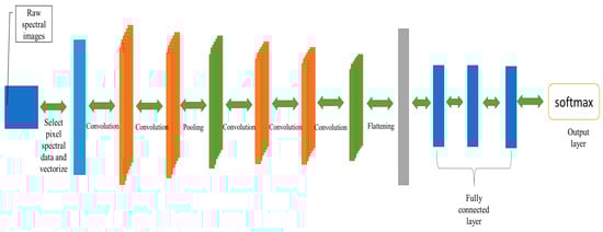 In the proposed method of this research, the role of the CNN model is to classify pixels based on their spectral features. Compared to other classification models, the core strength of CNN lies in its convolutional layers, which can rapidly extract classification features. This advantage becomes particularly pronounced in scenarios with high-dimensional feature spaces where classification efficiency is crucial. After feature selection, there are now only 88 features remaining in the spectral data. These features contribute significantly to pixel spectral classification, so the input for the CNN model should consist of these 88 feature data points to form a feature vector. The CNN classifier structure is as shown in Figure 5. The model comprises one input layer, four convolutional layers, two pooling layers, and three fully connected layers. The convolutional layers employ 1 × 4 convolutional kernels, and the pooling layers have a stride of 2. Table 2 provides a detailed list of the parameters for each layer in the model.