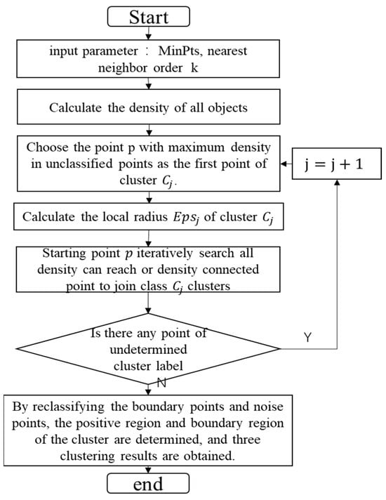 DBSCAN is a density-based spatial clustering algorithm that is robust to noise. This algorithm treats regions with sufficient density as distance centers and continually expands these regions. The algorithm is based on the fact that a cluster can be uniquely determined by any of its core objects. It utilizes the concept of density-based clustering, which requires that the number of objects contained within a certain region (eps) in the clustering space is not less than a given threshold (minPts). And it can discover clusters of arbitrary shapes in spatial data with noise. It connects adjacent regions with sufficiently high density, making it effective for clustering and handling outliers []. From an intuitive standpoint, this clustering algorithm can effectively identify dense regions within the sample points and offers the following advantages: