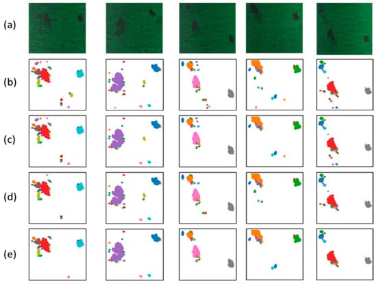 Partial sample detection results for the four methods. (a) The original hyper spectrum images. (b) Results of CNN-DBSCAN. (c) Results of DRSNet. (d) Results of CNN-Visual Transformer. (e) Results of GCN.