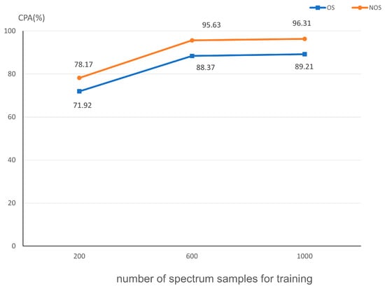 To further verify the robustness of the method proposed in this study, 600 and 200 randomly selected pixel spectral samples were taken from the collected 1000 samples, and the models were retrained with these different training sample quantities. The results of testing the models retrained with three different sample sizes are shown in Figure 9.