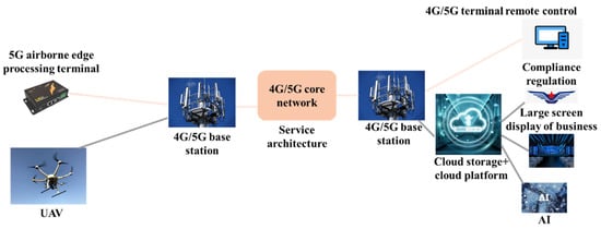 5G unmanned aerial vehicle-inspection technology combines mobile internet 5G, unmanned aerial vehicles, and big data analysis technology to achieve unmanned inspection and monitoring of pipeline health. Jiangsu Petroleum Company achieved unmanned inspection and monitoring of an 85 km oil pipeline section by utilizing six 5G base stations and a dedicated 5G low-altitude network built along the pipeline in conjunction with drones. The schematic diagram of its architecture is shown in Figure 2.