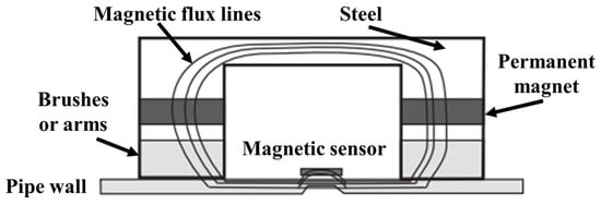 Magnetic flux leakage technology mainly uses permanent magnets to magnetize the pipe wall. When there are defects in the pipeline, the magnetic field lines will leak onto the surface of the pipeline, resulting in magnetic flux leakage. Subsequently, the magnetic flux-leakage signal is extracted by magnetic-sensing elements in order to detect pipeline defects. The schematic diagram is shown in Figure 3.